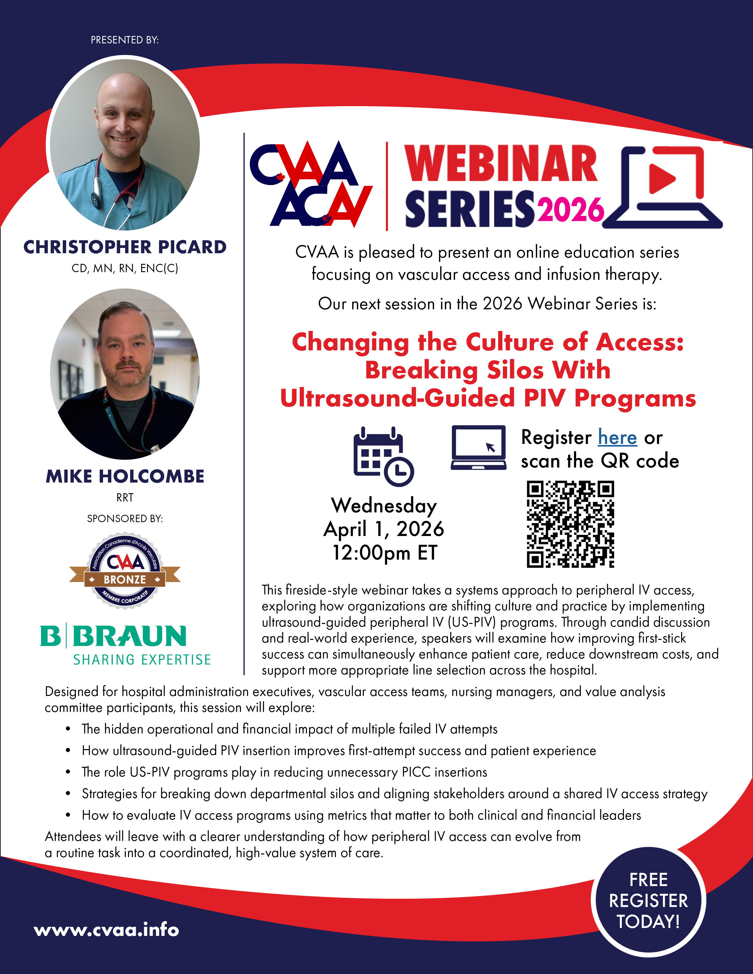ARCHIVED SESSION: December 4, 2024 (full flyer here) Building a Neonatal/Pediatric PICC Insertion Program: All Players Directly Back to “Go”!!! - Bryan Kitchen, RN, CN and Jen Wujec, RN Sponsored by Baxter To access the recording, log in and view under Members Area> CVAA Webinar Series